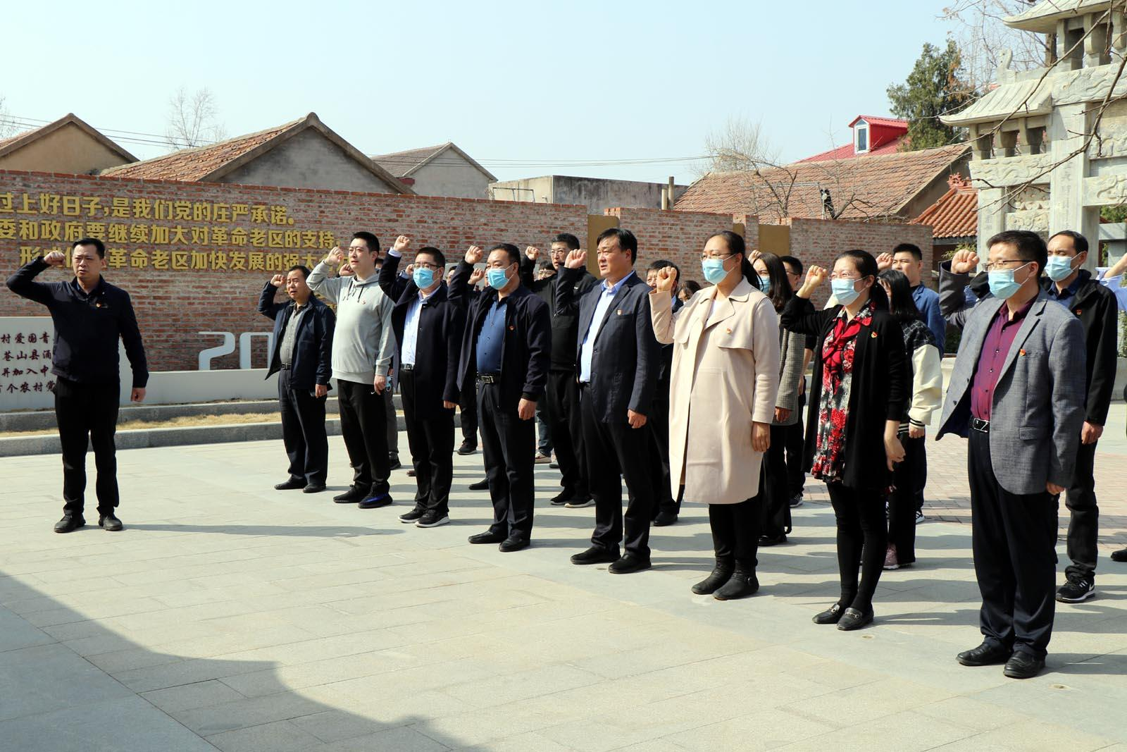 在朱村抗日战斗纪念碑前,全体党员右手握拳,面向纪念碑庄严宣誓,重温入党誓词,重寻入党初心。